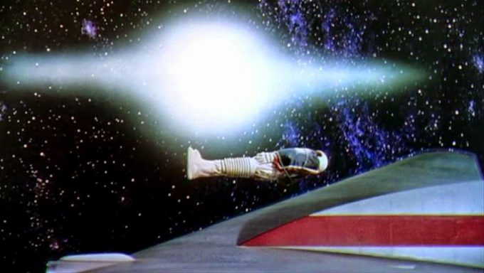 The 1955 film Conquest of Space, an early example of Angst Science Fiction. Here we see an astronaut named Andre Fodor, a victim of cosmic fate and indifference, being buried in space: His body floats off into the seemingly endless void against a brilliant Sol.